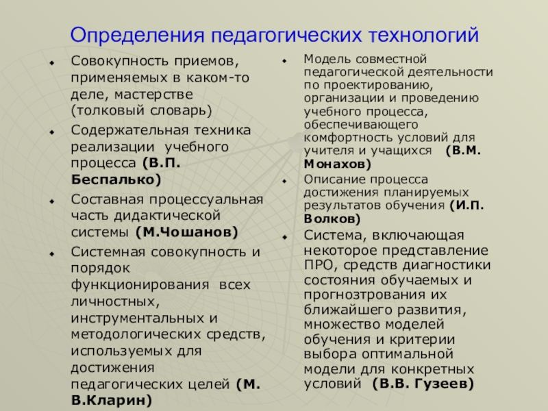 Система, включающая некоторое представление ПРО, средств диагностики состояния обучаемых и прогнозтрования их ближайшего развития, множество моделей обучения и критерии выбора оптимальной модели для конкретных условий (В.В. Гузеев)