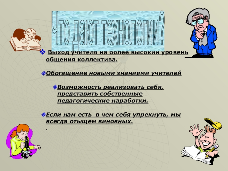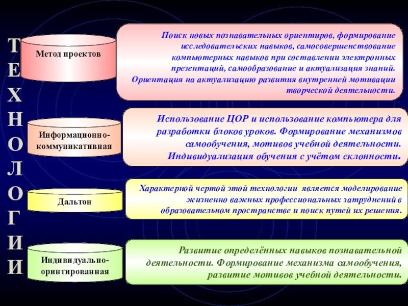 Поиск новых познавательных ориентиров, формирование исследовательских навыков, самосовершенствование компьютерных навыков при составлении электронных презентаций, самообразование и актуализация знаний. Ориентация на актуализацию развития внутренней мотивации творческой деятельности.