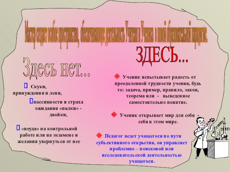 Педагог ведет учащегося по пути субъективного открытия, он управляет проблемно – поисковой или исследовательской деятельностью учащегося.