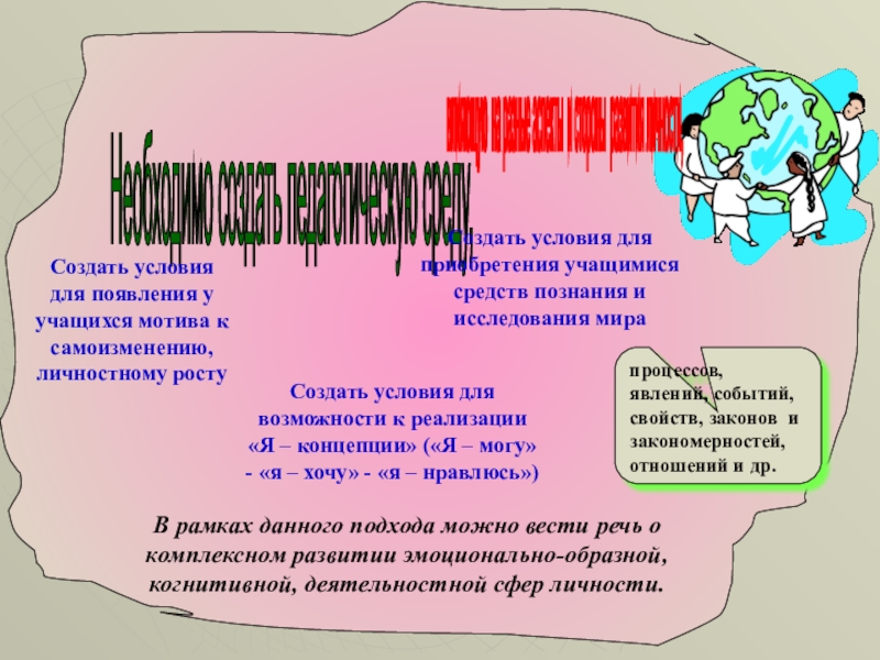 В рамках данного подхода можно вести речь о комплексном развитии эмоционально-образной, когнитивной, деятельностной сфер личности.