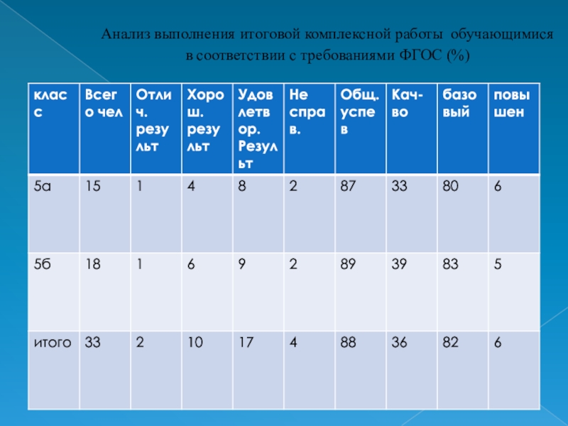 Слайд 10Анализ выполнения итоговой комплексной работы обучающимися в соответствии с требованиями ФГОС