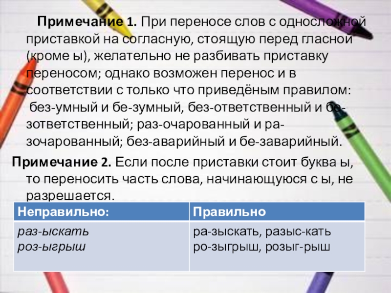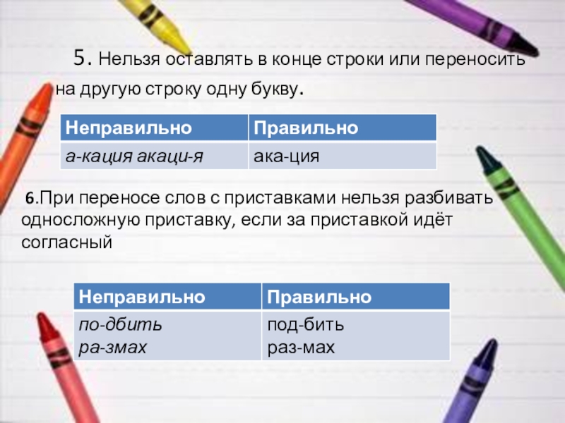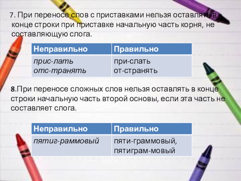 6.При переносе слов с приставками нельзя разбивать односложную приставку, если за приставкой идёт согласный