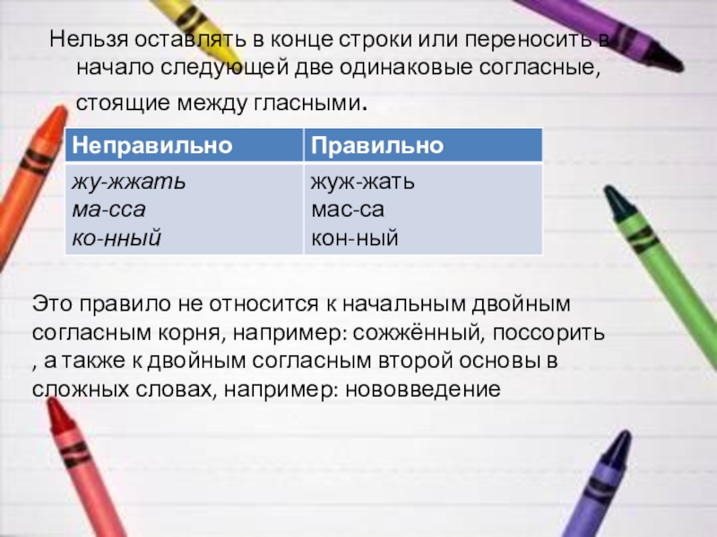 Это правило не относится к начальным двойным согласным корня, например: сожжённый, поссорить , а также к двойным согласным второй основы в сложных словах, например: нововведение