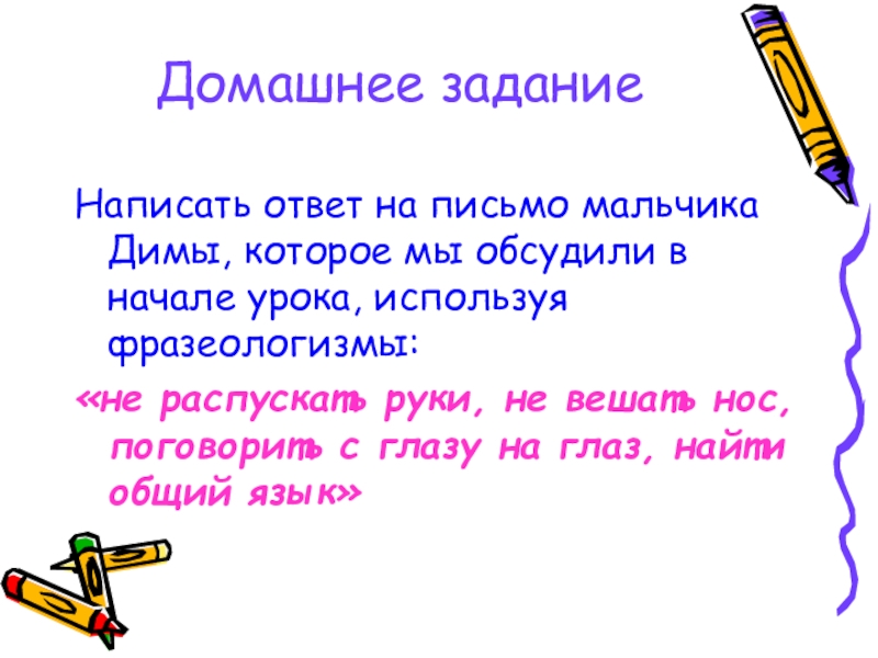Домашнее заданиеНаписать ответ на письмо мальчика Димы, которое мы обсудили в начале урока, используя фразеологизмы: «не распускать