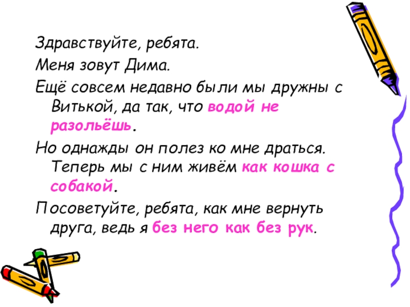 Здравствуйте, ребята.Меня зовут Дима. Ещё совсем недавно были мы дружны с Витькой, да так, что водой не разольёшь.Но однажды он полез ко мне драться. Теперь мы с ним живём как кошка с собакой.Посоветуйте, ребята, как мне