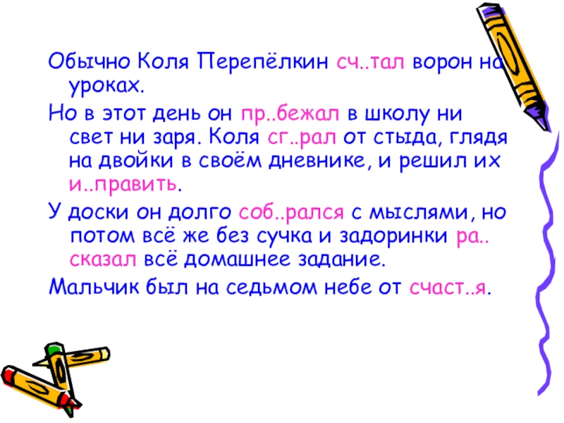 Обычно Коля Перепёлкин сч..тал ворон на уроках. Но в этот день он пр..бежал в школу ни свет