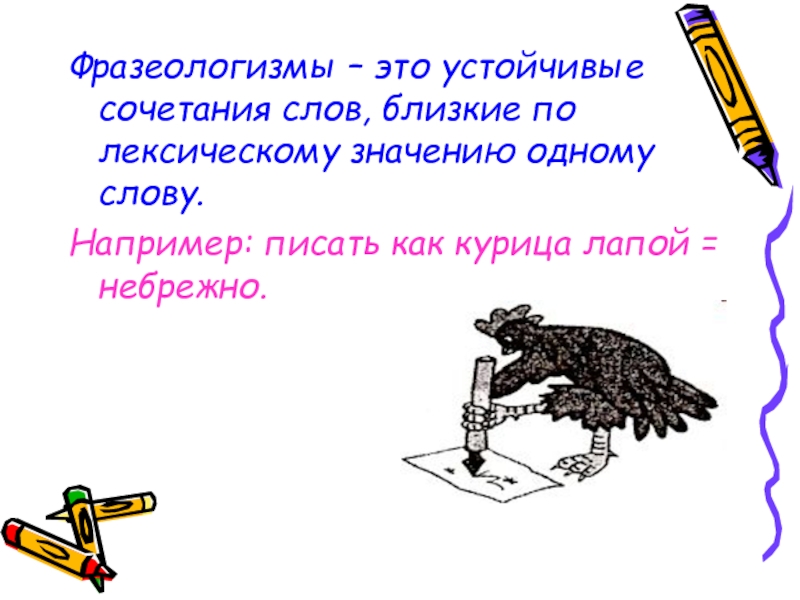 Фразеологизмы – это устойчивые сочетания слов, близкие по лексическому значению одному слову.Например: писать как курица лапой =
