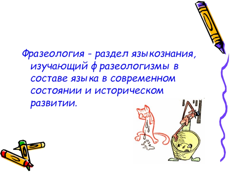 Фразеология - раздел языкознания, изучающий фразеологизмы в составе языка в современном состоянии и историческом развитии.