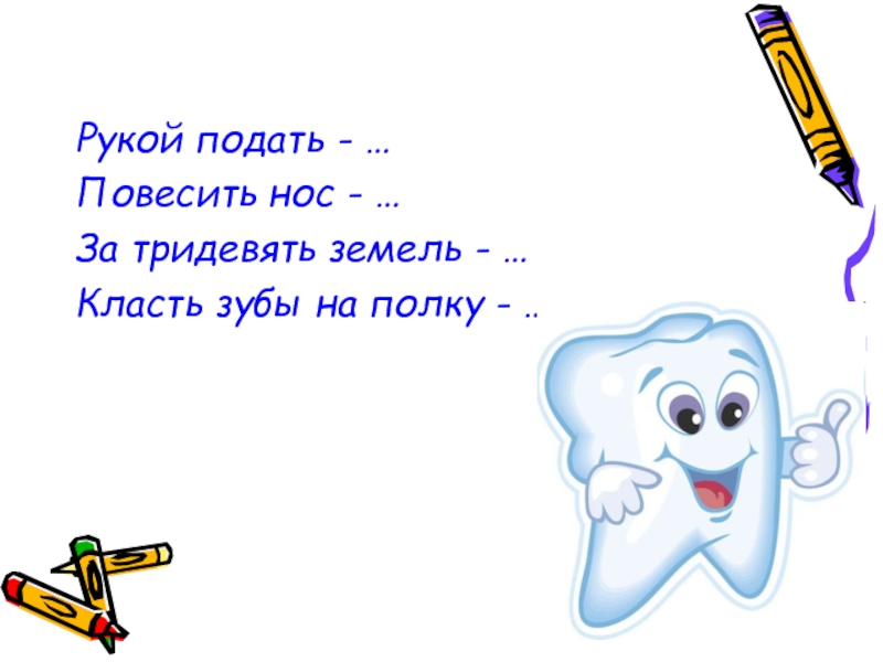 Рукой подать - …Повесить нос - …За тридевять земель - …Класть зубы на полку - …