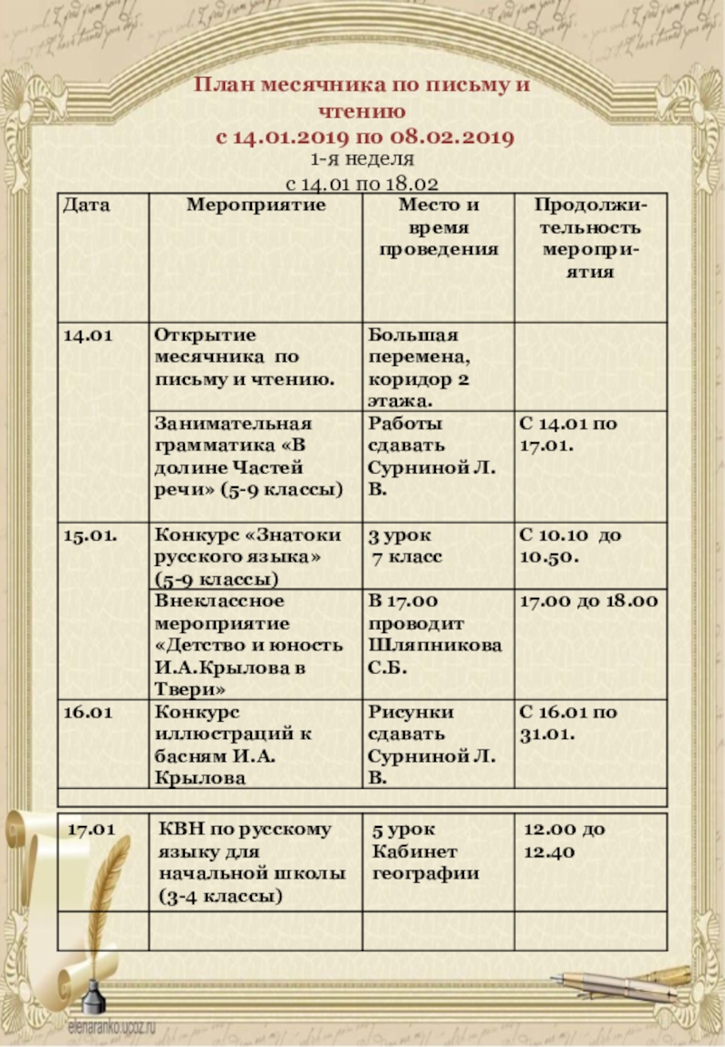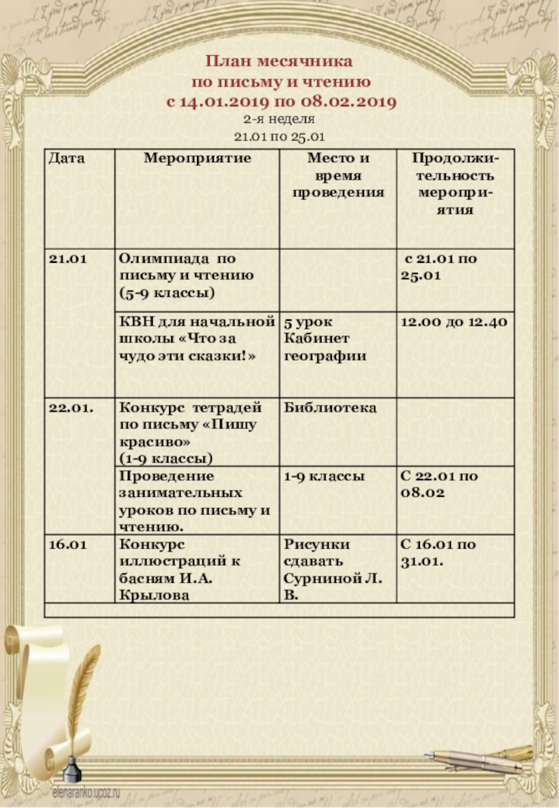 План месячника  по письму и чтению  с 14.01.2019 по 08.02.20192-я неделя21.01 по 25.01