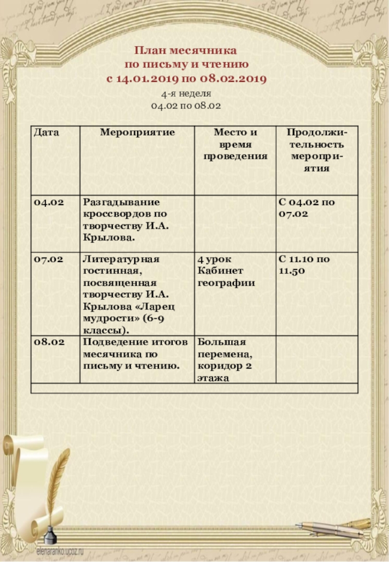 План месячника  по письму и чтению  с 14.01.2019 по 08.02.20194-я неделя04.02 по 08.02