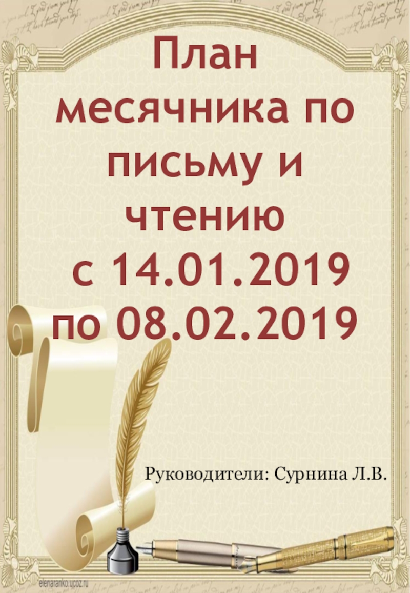План месячника по письму и чтению  с 14.01.2019 по 08.02.2019 Руководители: Сурнина Л.В.