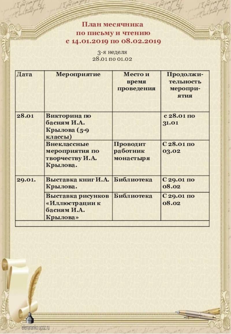 План месячника  по письму и чтению  с 14.01.2019 по 08.02.20193-я неделя28.01 по 01.02