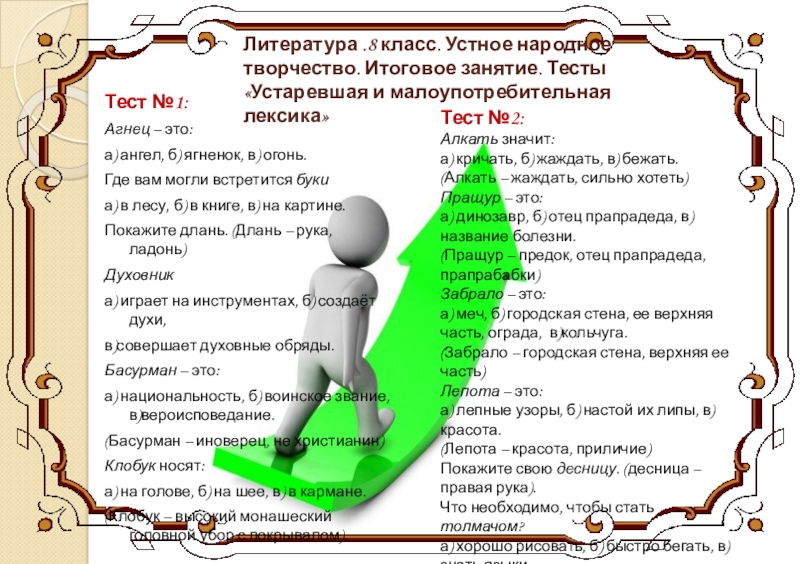 Литература .8 класс. Устное народное творчество. Итоговое занятие. Тесты «Устаревшая и малоупотребительная лексика»