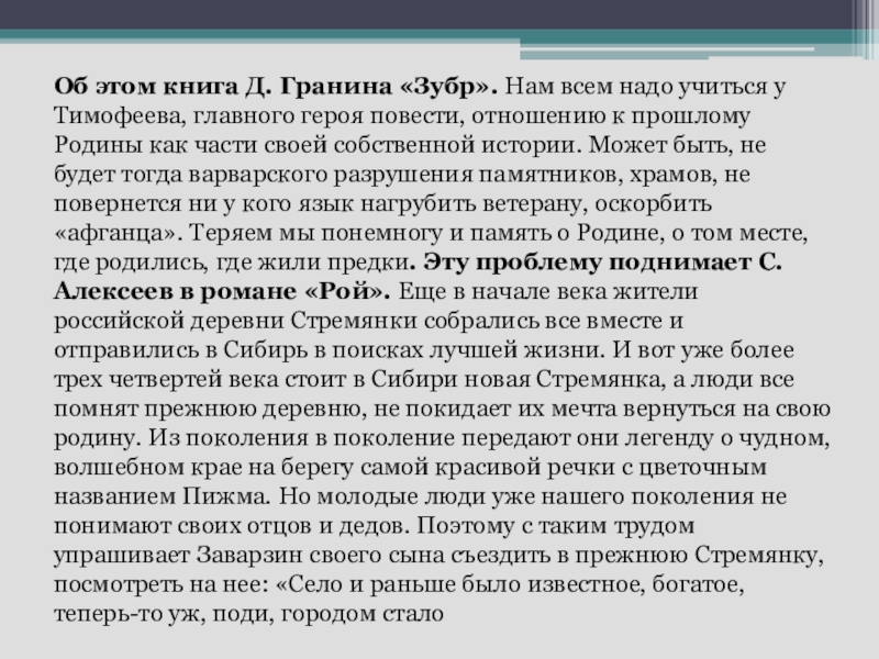Тимофеева, главного героя повести, отношению к прошлому Родины как части своей собственной истории. Может быть, не будет тогда варварского разрушения памятников, храмов, не повернется ни у кого язык нагрубить ветерану, оскорбить «афганца». Теряем мы понемногу и память о Родине, о том месте, где родились, где жили предки. Эту проблему поднимает С. Алексеев в романе «Рой». Еще в начале века жители российской деревни Стремянки собрались все вместе и отправились в Сибирь в поисках лучшей жизни. И вот уже более трех четвертей века стоит в Сибири новая Стремянка, а люди все помнят прежнюю деревню, не покидает их мечта вернуться на свою родину. Из поколения в поколение передают они легенду о чудном, волшебном крае на берегу самой красивой речки с цветочным названием Пижма. Но молодые люди уже нашего поколения не понимают своих отцов и дедов. Поэтому с таким трудом упрашивает Заварзин своего сына съездить в прежнюю Стремянку, посмотреть на нее: «Село и раньше было известное, богатое, теперь-то уж, поди, городом стало