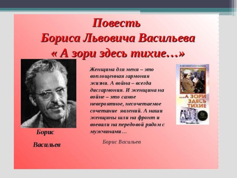 Слайд 9Б.Васильев «Не стреляйте в белых лебедей»(главный герой Егор Полушкин беспредельно любит