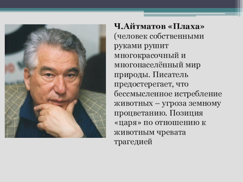 Слайд 6Ч.Айтматов «Плаха» (человек собственными руками рушит многокрасочный и многонаселённый мир природы.
