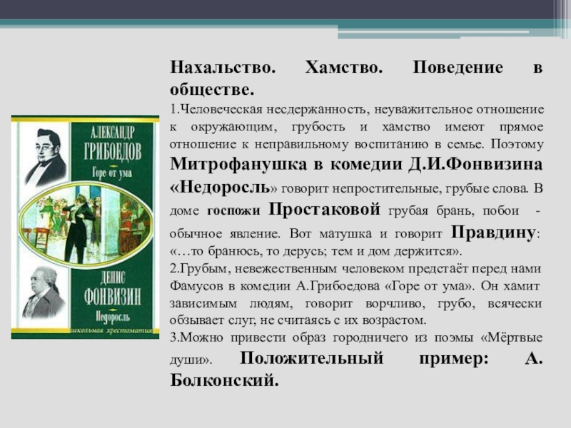 2.Грубым, невежественным человеком предстаёт перед нами Фамусов в комедии А.Грибоедова «Горе от ума». Он хамит зависимым людям, говорит ворчливо, грубо, всячески обзывает слуг, не считаясь с их возрастом.
