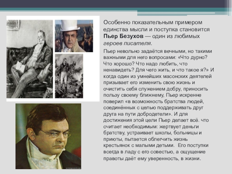 Особенно показательным примером единства мысли и поступка становится Пьер Безухов — один из любимых героев писателя.