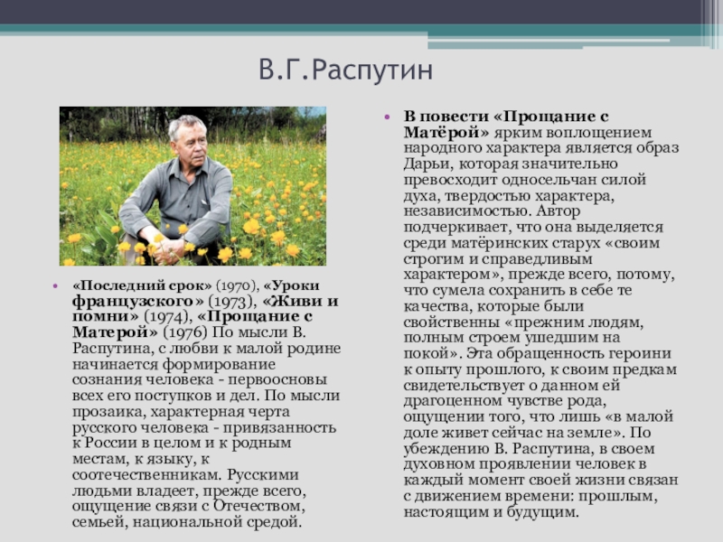 срок» (1970), «Уроки французского» (1973), «Живи и помни» (1974), «Прощание с Матерой» (1976) По мысли В. Распутина, с любви к малой родине начинается формирование сознания человека - первоосновы всех его поступков и дел. По мысли прозаика, характерная черта русского человека - привязанность к России в целом и к родным местам, к языку, к соотечественникам. Русскими людьми владеет, прежде всего, ощущение связи с Отечеством, семьей, национальной средой.