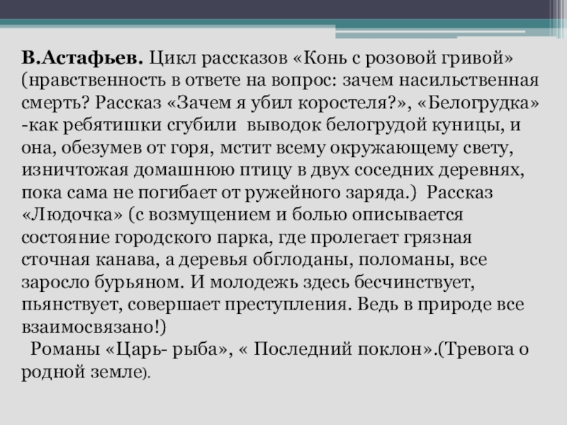 вопрос: зачем насильственная смерть? Рассказ «Зачем я убил коростеля?», «Белогрудка»-как ребятишки сгубили выводок белогрудой куницы, и она, обезумев от горя, мстит всему окружающему свету, изничтожая домашнюю птицу в двух соседних деревнях, пока сама не погибает от ружейного заряда.) Рассказ «Людочка» (с возмущением и болью описывается состояние городского парка, где пролегает грязная сточная канава, а деревья обглоданы, поломаны, все заросло бурьяном. И молодежь здесь бесчинствует, пьянствует, совершает преступления. Ведь в природе все взаимосвязано!)