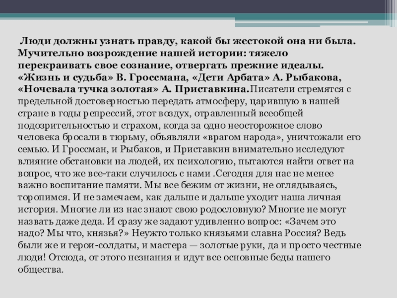 Мучительно возрождение нашей истории: тяжело перекраивать свое сознание, отвергать прежние идеалы. «Жизнь и судьба» В. Гроссмана, «Дети Арбата» А. Рыбакова, «Ночевала тучка золотая» А. Приставкина.Писатели стремятся с предельной достоверностью передать атмосферу, царившую в нашей стране в годы репрессий, этот воздух, отравленный всеобщей подозрительностью и страхом, когда за одно неосторожное слово человека бросали в тюрьму, объявляли «врагом народа», уничтожали его семью. И Гроссман, и Рыбаков, и Приставкин внимательно исследуют влияние обстановки на людей, их психологию, пытаются найти ответ на вопрос, что же все-таки случилось с нами .Сегодня для нас не менее важно воспитание памяти. Мы все бежим от жизни, не оглядываясь, торопимся. И не замечаем, как дальше и дальше уходит наша личная история. Многие ли из нас знают свою родословную? Многие не могут назвать даже деда. И сразу же задают удивленно вопрос: «Зачем это надо? Мы что, князья?» Неужто только князьями славна Россия? Ведь были же и герои-солдаты, и мастера — золотые руки, да и просто честные люди! Отсюда, от этого незнания и идут все основные беды нашего общества.