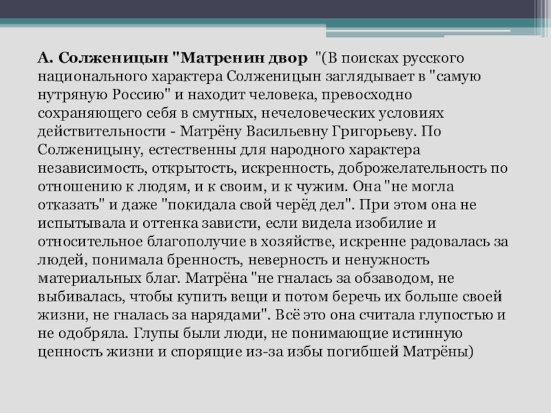 в "самую нутряную Россию" и находит человека, превосходно сохраняющего себя в смутных, нечеловеческих условиях действительности - Матрёну Васильевну Григорьеву. По Солженицыну, естественны для народного характера независимость, открытость, искренность, доброжелательность по отношению к людям, и к своим, и к чужим. Она "не могла отказать" и даже "покидала свой черёд дел". При этом она не испытывала и оттенка зависти, если видела изобилие и относительное благополучие в хозяйстве, искренне радовалась за людей, понимала бренность, неверность и ненужность материальных благ. Матрёна "не гналась за обзаводом, не выбивалась, чтобы купить вещи и потом беречь их больше своей жизни, не гналась за нарядами". Всё это она считала глупостью и не одобряла. Глупы были люди, не понимающие истинную ценность жизни и спорящие из-за избы погибшей Матрёны)
