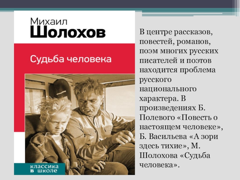 находится проблема русского национального характера. В произведениях Б. Полевого «Повесть о настоящем человеке», Б. Васильева «А зори здесь тихие», М. Шолохова «Судьба человека».