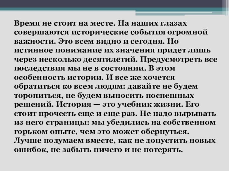 огромной важности. Это всем видно и сегодня. Но истинное понимание их значения придет лишь через несколько десятилетий. Предусмотреть все последствия мы не в состоянии. В этом особенность истории. И все же хочется обратиться ко всем людям: давайте не будем торопиться, не будем выносить поспешных решений. История — это учебник жизни. Его стоит прочесть еще и еще раз. Не надо вырывать из него страницы: мы убедились на собственном горьком опыте, чем это может обернуться. Лучше подумаем вместе, как не допустить новых ошибок, не забыть ничего и не потерять.