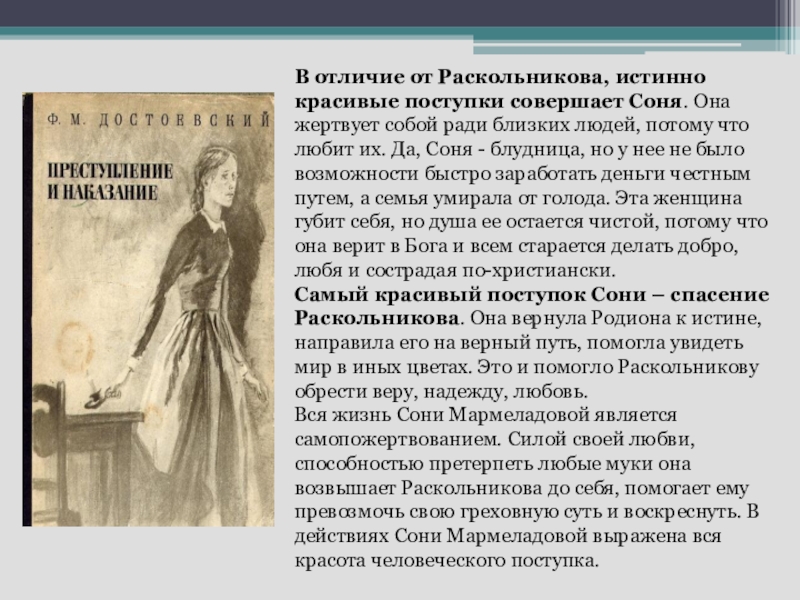 собой ради близких людей, потому что любит их. Да, Соня - блудница, но у нее не было возможности быстро заработать деньги честным путем, а семья умирала от голода. Эта женщина губит себя, но душа ее остается чистой, потому что она верит в Бога и всем старается делать добро, любя и сострадая по-христиански.