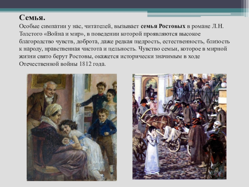 «Война и мир», в поведении которой проявляются высокое благородство чувств, доброта, даже редкая щедрость, естественность, близость к народу, нравственная чистота и цельность. Чувство семьи, которое в мирной жизни свято берут Ростовы, окажется исторически значимым в ходе Отечественной войны 1812 года.