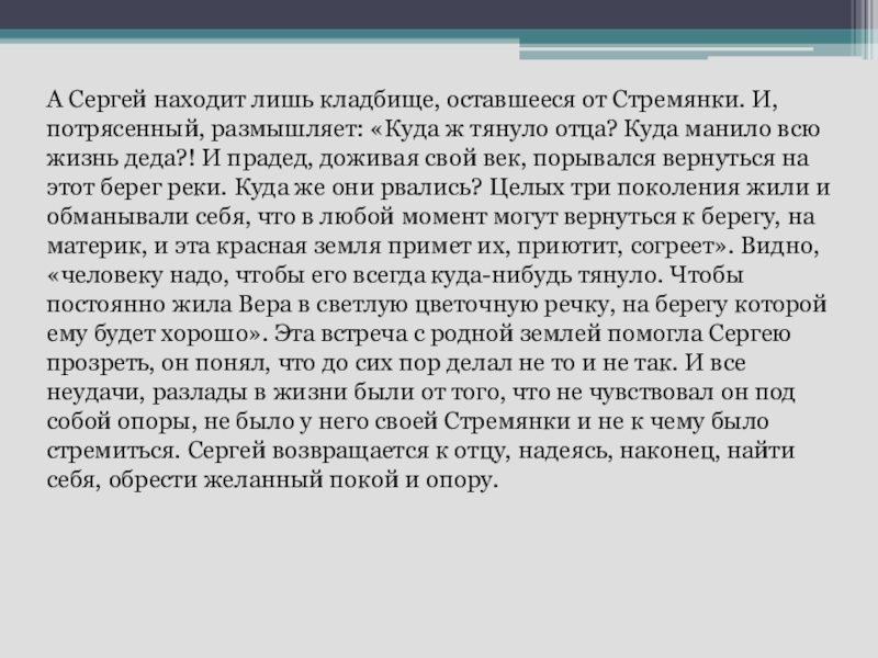 Слайд 16А Сергей находит лишь кладбище, оставшееся от Стремянки. И, потрясенный, размышляет: