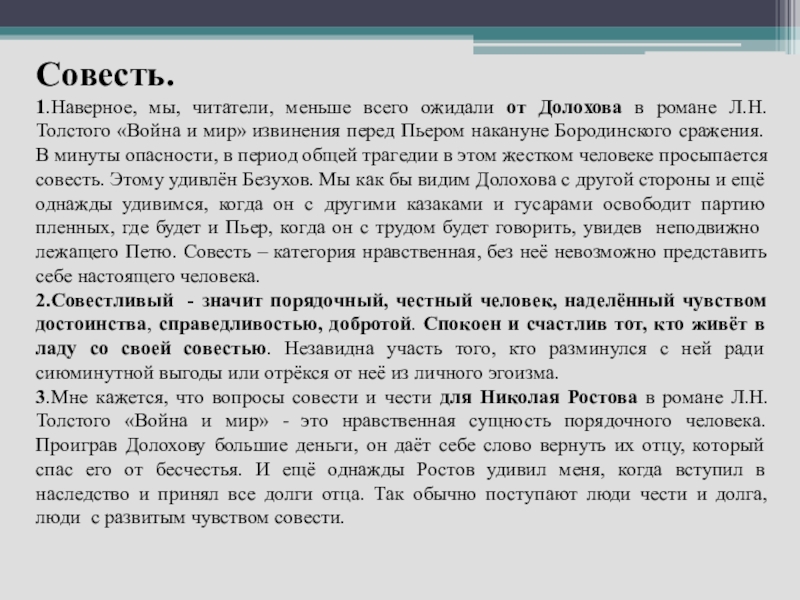 «Война и мир» извинения перед Пьером накануне Бородинского сражения. В минуты опасности, в период общей трагедии в этом жестком человеке просыпается совесть. Этому удивлён Безухов. Мы как бы видим Долохова с другой стороны и ещё однажды удивимся, когда он с другими казаками и гусарами освободит партию пленных, где будет и Пьер, когда он с трудом будет говорить, увидев неподвижно лежащего Петю. Совесть – категория нравственная, без неё невозможно представить себе настоящего человека.