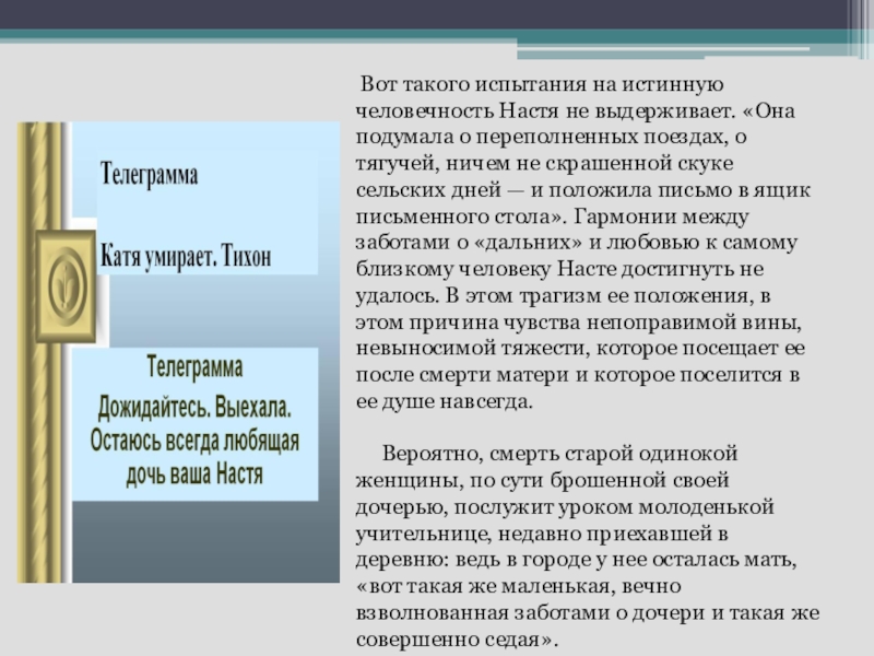 Вот такого испытания на истинную человечность Настя не выдерживает. «Она подумала о переполненных поездах, о тягучей, ничем не скрашенной скуке сельских дней — и положила письмо в ящик письменного стола». Гармонии между заботами о «дальних» и любовью к самому близкому человеку Насте достигнуть не удалось. В этом трагизм ее положения, в этом причина чувства непоправимой вины, невыносимой тяжести, которое посещает ее после смерти матери и которое поселится в ее душе навсегда.