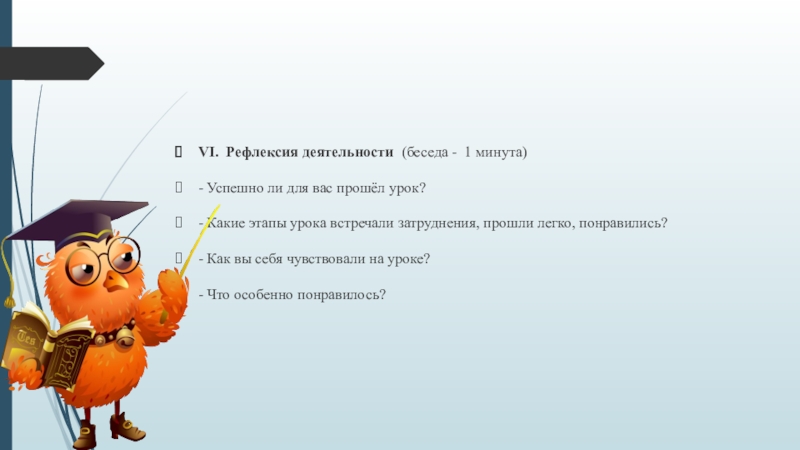 Слайд 21VI. Рефлексия деятельности (беседа - 1 минута)