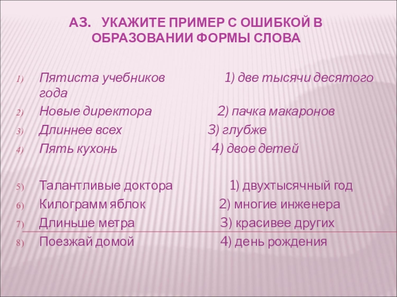 В содержание заданий, нацеленных на усвоение морфологических норм русского литературного языка, включены различные грамматические ошибки, состоящие в неправильном образовании и использовании различных грамматических форм слов: