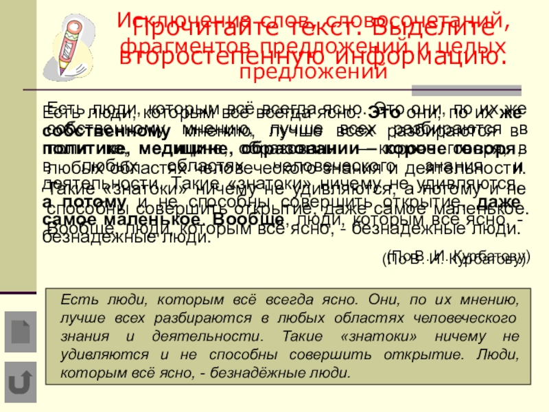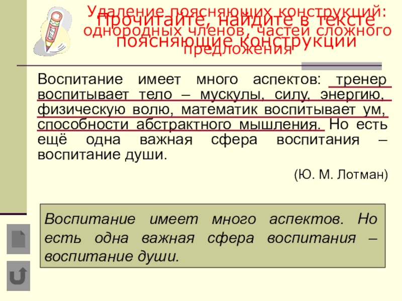 Удаление поясняющих конструкций: однородных членов, частей сложного предложения