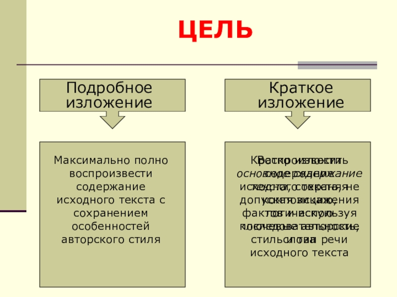 Воспроизвести основное содержание текста, сохраняя композицию, логическую последовательность, стиль и тип речи исходного текста