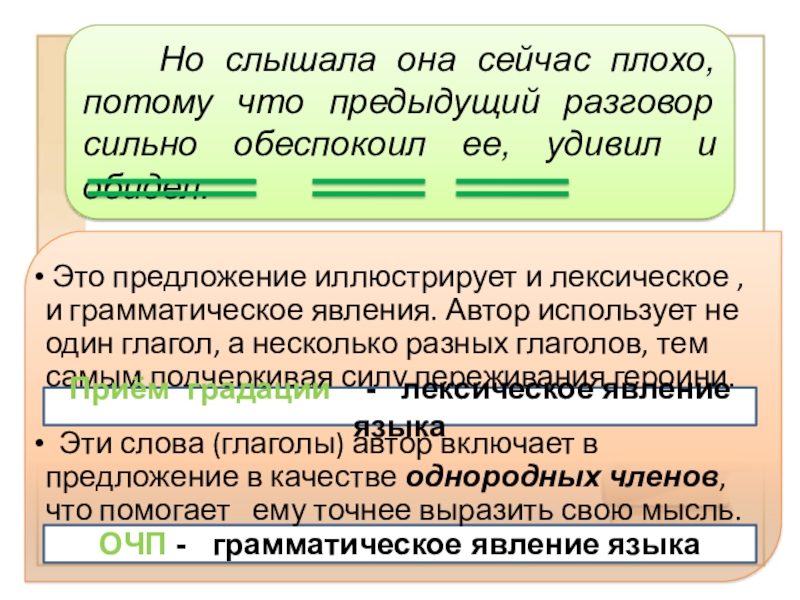 Это предложение иллюстрирует и лексическое , и грамматическое явления. Автор использует не один глагол, а несколько разных глаголов, тем самым подчеркивая силу переживания героини.