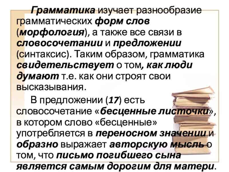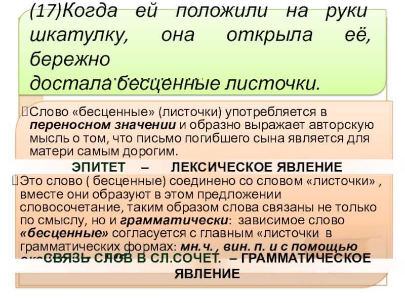 Слово «бесценные» (листочки) употребляется в переносном значении и образно выражает авторскую мысль о том, что письмо погибшего сына является для матери самым дорогим.
