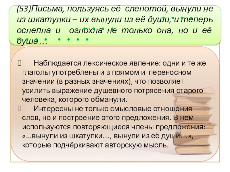 Интересны не только смысловые отношения слов, но и построение этого предложения. В нем используются повторяющиеся члены предложения: «...вынули из шкатулки…, вынули из её души…», которые подчёркивают авторскую мысль.