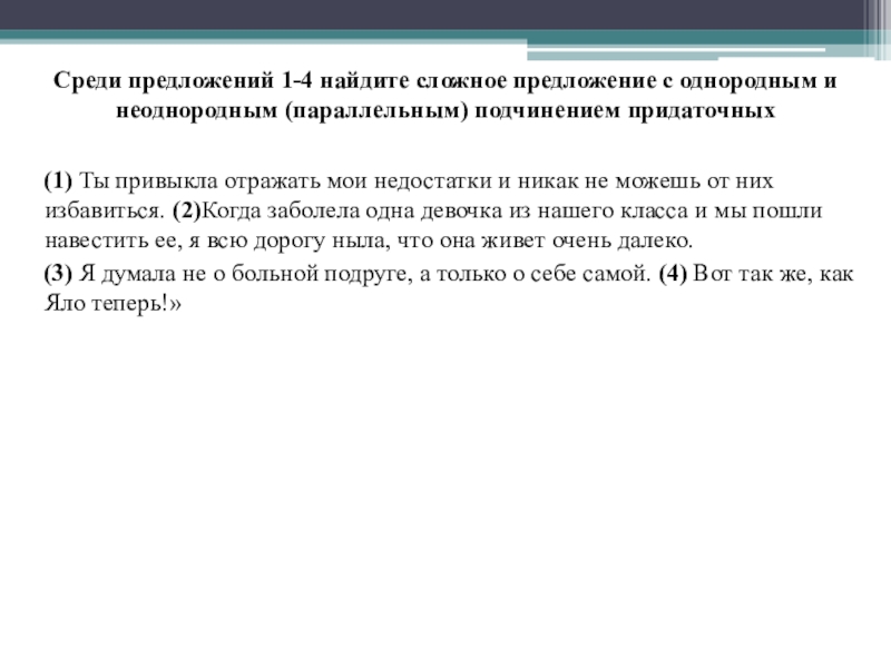 Слайд 19Среди предложений 1-4 найдите сложное предложение с однородным и неоднородным (параллельным) подчинением придаточных