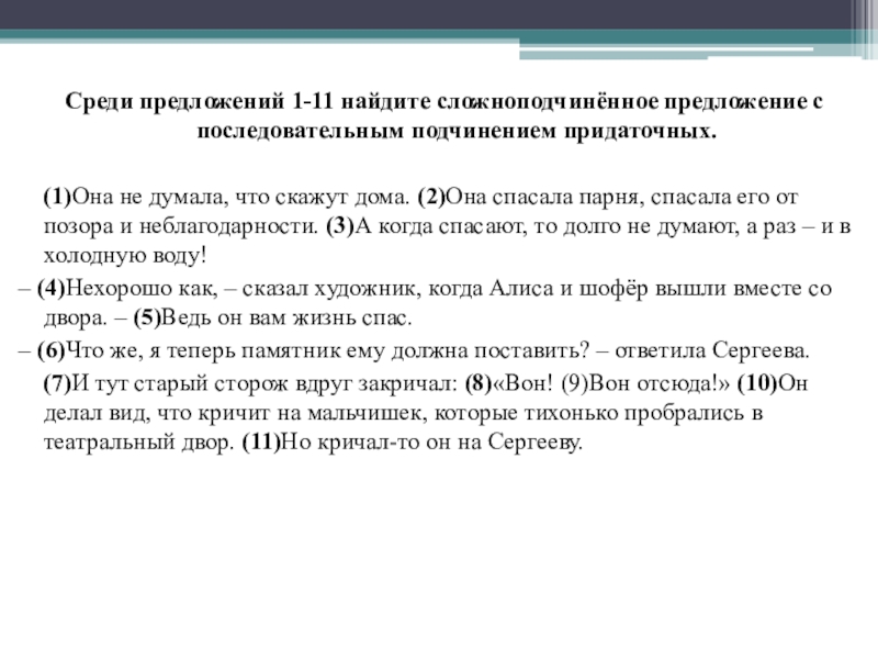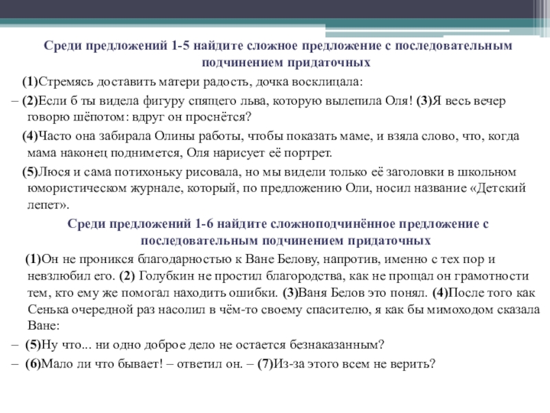 Слайд 21Среди предложений 1-5 найдите сложное предложение с последовательным подчинением придаточных