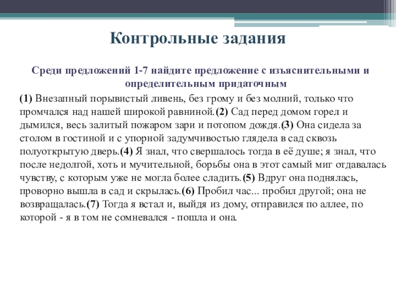 (1) Внезапный порывистый ливень, без грому и без молний, только что промчался над нашей широкой равниной.(2) Сад перед домом горел и дымился, весь залитый пожаром зари и потопом дождя.(3) Она сидела за столом в гостиной и с упорной задумчивостью глядела в сад сквозь полуоткрытую дверь.(4) Я знал, что свершалось тогда в её душе; я знал, что после недолгой, хоть и мучительной, борьбы она в этот самый миг отдавалась чувству, с которым уже не могла более сладить.(5) Вдруг она поднялась, проворно вышла в сад и скрылась.(6) Пробил час... пробил другой; она не возвращалась.(7) Тогда я встал и, выйдя из дому, отправился по аллее, по которой - я в том не сомневался - пошла и она.