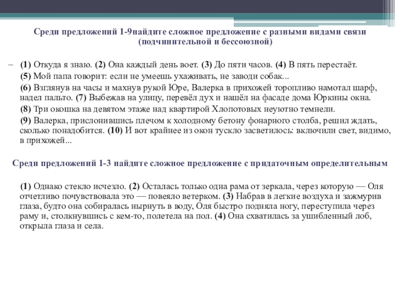 Слайд 22Среди предложений 1-9найдите сложное предложение с разными видами связи (подчинительной и бессоюзной)
