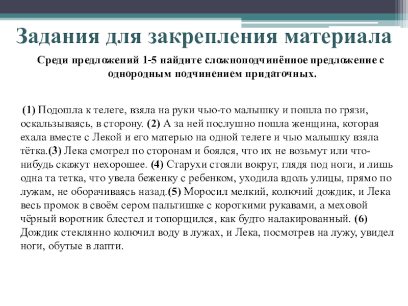 (1) Подошла к телеге, взяла на руки чью-то малышку и пошла по грязи, оскальзываясь, в сторону. (2) А за ней послушно пошла женщина, которая ехала вместе с Лекой и его матерью на одной телеге и чью малышку взяла тётка.(3) Лека смотрел по сторонам и боялся, что их не возьмут или что-нибудь скажут нехорошее. (4) Старухи стояли вокруг, глядя под ноги, и лишь одна та тетка, что увела беженку с ребенком, уходила вдоль улицы, прямо по лужам, не оборачиваясь назад.(5) Моросил мелкий, колючий дождик, и Лека весь промок в своём сером пальтишке с короткими рукавами, а меховой чёрный воротник блестел и топорщился, как будто налакированный. (6) Дождик стеклянно колючил воду в лужах, и Лека, посмотрев на лужу, увидел ноги, обутые в лапти.