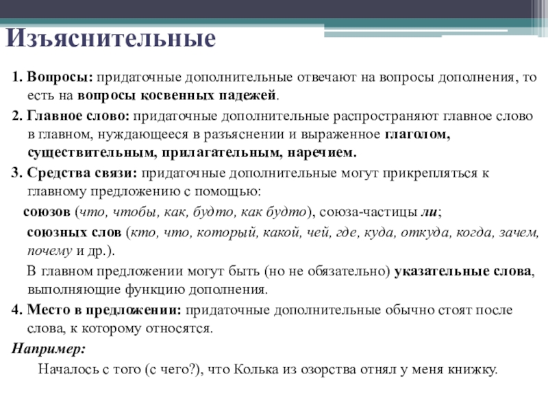 2. Главное слово: придаточные дополнительные распространяют главное слово в главном, нуждающееся в разъяснении и выраженное глаголом, существительным, прилагательным, наречием.