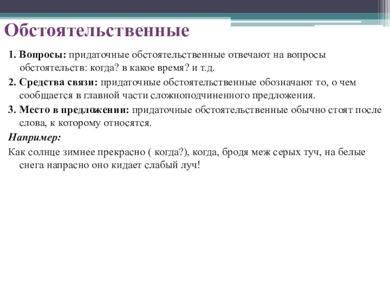 1. Вопросы: придаточные обстоятельственные отвечают на вопросы обстоятельств: когда? в какое время? и