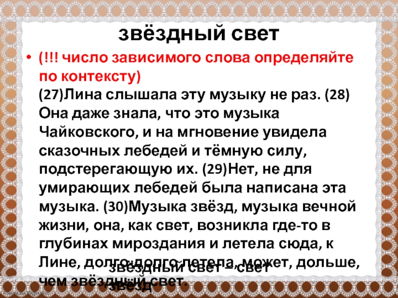 музыку не раз. (28)Она даже знала, что это музыка Чайковского, и на мгновение увидела сказочных лебедей и тёмную силу, подстерегающую их. (29)Нет, не для умирающих лебедей была написана эта музыка. (30)Музыка звёзд, музыка вечной жизни, она, как свет, возникла где-то в глубинах мироздания и летела сюда, к Лине, долго-долго летела, может, дольше, чем звёздный свет.