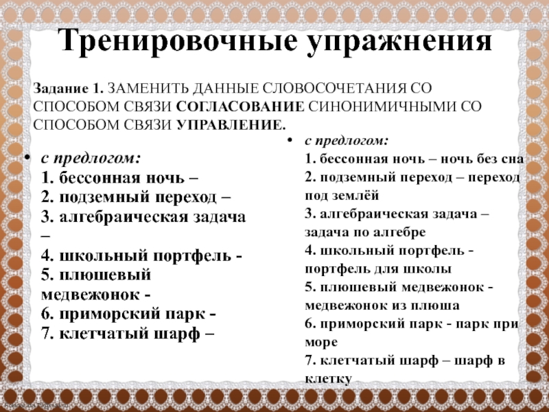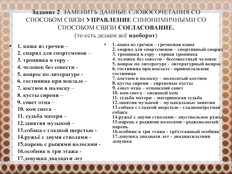 1. Замените данные словосочетания, построенные на основе согласования, синонимичным словосочетанием со связью управление. Напишите получившиеся словосочетания.
